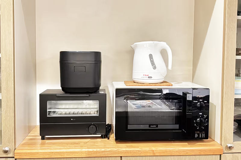 キッチンには3口コンロをはじめ、電子レンジ、電気ケトル、トースター、炊飯器、冷蔵庫・冷凍庫など、日常使いに十分な設備をそろえています。